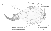 Primitive features such as jaw ossifications, a palatoquadrate, and a Meckel's cartilage are present in the Asterolepis that are important features shared between antiarchs and other Gnathostomata. Additionally the Asterolepis has box-like dermal armour covering the head and thorax with highly modified pectoral fins that are enclosed in interlocking dermal plates protecting a cartilaginous endocranium and gill region. Also, the vertebral column and the pectoral girdle are cartilaginous.[3] The Asterolepis does not have an anal fin or pelvic fins. However it does have a caudal and dorsal fin. Both are covered in similar scales.[5]