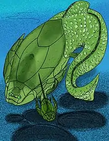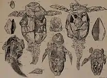 Asterolepis is an extinct genus of antiarch placoderms from the Devonian of North and South America and Europe.[1] They were heavily armored flat-headed benthic detritivores with distinctive jointed limb-like pectoral fins[2] and hollow spine.[3] The armor plate gives the Asterolepis a box-like shape. Its pectoral fins are also armored but the caudal and dorsal fin are not. The first fossils were named by M. Eichwald in 1840 after noticing star-like markings on the fossils.
