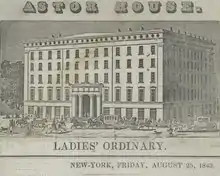 ![]() The Astor House in 1862, with St. Paul's Chapel to the left | |