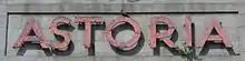 Edward Stone was regarded as "a specialist theatre and cinema architect".[42] He designed the Astoria in a French Art Deco style—similar to, but a "larger and more elaborate example" of, his Grade II-listed Whitehall Theatre[note 2] in London.[27] The walls were of brick with faience decoration and a façade of pale stone blocks, hiding a steel frame and topped by a flat roof.[27] The "handsome" façade was 45 metres (148 ft) wide and was simply detailed, "avoiding gratuitous decoration" and instead "[relying] mainly on proportion to achieve a sense of spacious grandeur".[1] It was in two parts: to the left (south), a slightly recessed ten-bay section with a strong horizontal emphasis, consisting of shop units (latterly boarded up) at ground-floor level, a tea-room above and offices on the top floor. Straight-headed casement windows with metal grilles lit this section. To the right (north) was the projecting entrance section which in contrast has a vertical emphasis: above the entrance canopy and modern double entrance door, three tall straight-headed windows at first-floor level were joined to tall arched windows above by fluted pilasters.[27][41] The second-floor windows were set into moulded recesses with keystones. Above these, a slightly recessed panel bore the name astoria in projecting letters.[27]