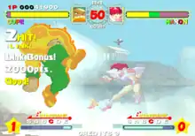 Players control with an 8-way joystick and six buttons, similar to one of the two arcade cabinet versions of the 1987 Street Fighter and its sequel Street Fighter II. However, the six basic moves work differently compared to typical six-button layouts. The two heavy attack buttons usually send the opponent flying across the stage; however, sometimes the opponent can bounce off the side of the screen. Depending on how aggressively the combos are performed, sometimes the opponent bounces back and forth around the screen like in pinball (as indicated by the game). The player's character can move briefly below or above the screen, which can be used for dodging attacks or chasing opponents above or below the screen. The energy bars below the screen are "Star Rank" bars, which are used for filling enough energy to perform one of two desperation moves per playable character called "Star Specials".
