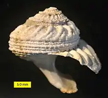 Shells of species within this genus can reach a size of about 60 millimetres (2.4 in). They have the appearance of a smooth conical shell. The outer edges of the coiled whorls are quite flattened, with prominent axial sculpture . Below widely it is umbilicate and concave.[3]