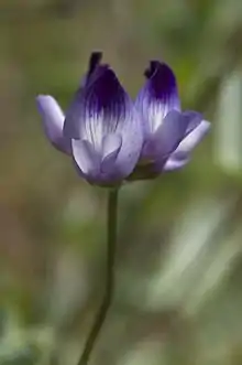 This is a hairy annual herb with thin stems growing up to 30 cm (12 in) long. The leaves are a few centimeters long and made up of a few oval-shaped leaflets. The inflorescence is a head of two to ten flowers which are pinkish purple in color with paler tips. This fruit is a cylindrical legume pod up to 6 cm (2.4 in) long with a sharp, pointed beak at the end.