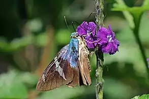Astraptes fulgerator, the two-barred flasher, is a spread-wing skipper butterfly in the genus Astraptes which may constitute a possible cryptic species complex. It ranges all over the Americas, from the southern United States to northern Argentina.