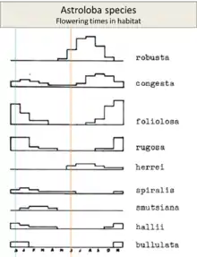 Natural hybrids of these species occur, and there are several varieties which are unresolved as to whether they constitute intermediate forms, hybrids or separate species. In addition there are naturally occurring hybrids between species of Astroloba and Tulista (formerly Haworthia Robustipedunculares), including the well-known ones named × Astrolista bicarinata (formerly x Astroworthia bicarinata / skinneri) which are crosses between Astroloba corrugata and Tulista pumila.[12]