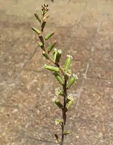 This species produces cream-white flowers in the rainy season (July to March depending on region), tinged with green or yellow. Like its eastern relative Astroloba congesta its flowers have unusually short pedicels. However Astroloba congesta has wider stems and concave upper faces to its leaves. Its close relative to the west, Astroloba robusta, has no pedicels at all and longer grey-brown leaves.[1]