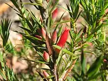 Astroloma humifusum grows as a spreading mat-like shrub up to 50 cm (20 in) high and 0.5 to 1.5 m (20 in to 5 ft) across.[2] Its hairy stems bear blue-green pine-like acute leaves 0.5-1.2 cm (0.2-0.5 in) long. The tubular flowers are up to 2 cm (0.8 in) long and appear from February to June, and are all red, unlike the red and green flowers of A. pinifolium. Flowers are followed by green globular berries around 0.4-0.6 cm (0.2 in) in diameter, which become reddish as they ripen.[3]