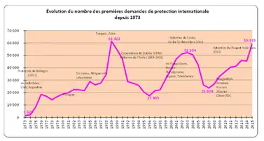 Since 1946, asylum seekers heading for France experienced an increasing trend with the need for recovering the economy. In 1951, French joined the Convention Relating to the Status of Refugees and formally wrote the right of asylum to its constitution. In July 1952, OFPRA was formally established by a new law, as a professional, independent office for affairs of asylum applications.[17] With the legalisation of refugee status, rights of asylum seekers in France could be protected. Data showed that France received about 15,000 asylum seekers annually on average, until 1960.[18] Yet entering into the 1970s to 1980s, applications for asylum increased at a higher pace and then prompted France to change some of its asylum policies.