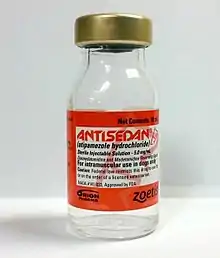 Atipamezole (brand name Antisedan, also available in generic forms[1] as Revertidine,[2] is a synthetic α2 adrenergic receptor antagonist indicated for the reversal of the sedative and analgesic effects of dexmedetomidine and medetomidine in dogs. Its reversal effect works by competing with the sedative for α2-adrenergic receptors and displacing them. It is mainly used in veterinary medicine, and while it is only licensed for dogs and for intramuscular use, it has been used intravenously, as well as in cats and other animals. There is a low rate of side effects, largely due to atipamezole's high specificity for the α2-adrenergic receptor. Atipamezole has a very quick onset, usually waking an animal up within 5 to 10 minutes.