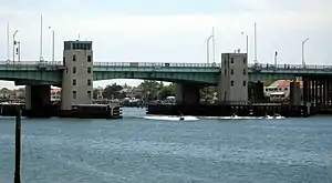 The Atlantic Beach Bridge is a 1,173-foot (358 m) long toll drawbridge carrying NY 878, connecting Lawrence and Atlantic Beach (Park Street), New York, while passing over the west end of Reynolds Channel. The bridge also provides direct access to the Rockaway Peninsula via Seagirt Boulevard. The original bridge opened in 1927, and the current bridge opened in 1952 and rebuilt in 1998.