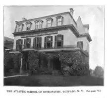In 1898 Dr. Schuyler C. Mathews and Dr. Virgil A. Hook recruited several influential philanthropists, formed an organization, and then received a charter for the Atlantic School of Osteopathy on February 21, 1899.[1] The first presidents of the school were "Dr. V. A. Hook, Mr. J. C. Bell, and Dr. [John] W. Banning" and the first term began in February 1899.[2] Dr. William Smith, a Scottish physician, briefly served as president in 1900. Originally the school was located in the Simon Long Building in Wilkes-Barre until the school purchased and remodeled the Central Methodist Episcopal Church in that same city.[3] In 1904 the school moved to Buffalo, New York. In 1905 the Buffalo Municipal Court issued a warrant for Banning's arrest due to his issuing diplomas without approval from the state board of regents.[4] By 1906 the Atlantic School of Osteopathy merged with the American School of Osteopathy (now known as A.T. Still University) based in Missouri.[5][6]