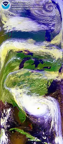 In 1494, Christopher Columbus experienced a tropical cyclone, which led to the first written European account of a hurricane.[31] In 1686, Edmund Halley presented a systematic study of the trade winds and monsoons and identified solar heating as the cause of atmospheric motions.[32] In 1735, an ideal explanation of global circulation through study of the trade winds was written by George Hadley.[33] In 1743, when Benjamin Franklin was prevented from seeing a lunar eclipse by a hurricane, he decided that cyclones move in a contrary manner to the winds at their periphery.[34] Understanding the kinematics of how exactly the rotation of the Earth affects airflow was partial at first. Gaspard-Gustave Coriolis published a paper in 1835 on the energy yield of machines with rotating parts, such as waterwheels.[35] In 1856, William Ferrel proposed the existence of a circulation cell in the mid-latitudes, and the air within deflected by the Coriolis force resulting in the prevailing westerly winds.[36] Late in the 19th century, the motion of air masses along isobars was understood to be the result of the large-scale interaction of the pressure gradient force and the deflecting force. By 1912, this deflecting force was named the Coriolis effect.[37] Just after World War I, a group of meteorologists in Norway led by Vilhelm Bjerknes developed the Norwegian cyclone model that explains the generation, intensification and ultimate decay (the life cycle) of mid-latitude cyclones, and introduced the idea of fronts, that is, sharply defined boundaries between air masses.[38] The group included Carl-Gustaf Rossby (who was the first to explain the large scale atmospheric flow in terms of fluid dynamics), Tor Bergeron (who first determined how rain forms) and Jacob Bjerknes.
