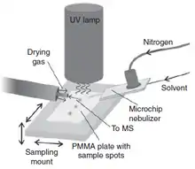 APPI has also been effectively applied for ambient ionization applications lending itself to several practical configurations. One configuration termed Desorption APPI (DAPPI) was developed by Haapala et al. and is pictured in the figure here. This device has been applied to the analysis of drugs of abuse in various solid phases, drug metabolites and steroids in urine, pesticides in plant material, etc.[29][30] APPI has also been interfaced to a DART (direct analysis in real time) source and shown for non-polar compounds such as steroids and pesticides to enhance signal by up to an order of magnitude for N2 flow, which is preferred for DART because it is significantly cheaper and easier to generate then the higher performing use of He. Commercial APPI sources have also been adapted to accept an insertable sampling probe that can deliver or liquid or solid sample to the nebulizer for vaporization and ionization. This configuration is similar to atmospheric solid analysis probe (ASAP) that is based on the use of APCI and therefore is referred to as APPI-ASAP. The benefits of APPI-ASAP vs. APCI-ASAP are similar to those observed in LC/MS, namely higher sensitivity to lower polarity compounds and less background signal for samples in complex matrices.[31] As much as ambient ionization has experienced a renaissance in the last decade or so, in fact this application has been practiced in the security industry for many decades. Just recall the swab detections we have all experienced at airports. The swabs collect condensed phase material from surfaces and are then inserted into a thermal desorber and ionizer assembly that then flows into the ion detector, which in most cases are an ion mobility spectrometer (IMS), but in later cases have been MS analyzers. A picture of a swab-APPI-IMS system used in airports and other security venues is given in the left figure