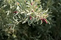 Atriplex cinerea, commonly known as grey saltbush, coast saltbush, barilla or truganini, is a plant species in the family Amaranthaceae.[3] It occurs in sheltered coastal areas and around salt lakes in the Australian states of Western Australia, South Australia, Tasmania, Victoria and New South Wales.[4][5]