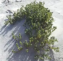 Atriplex hollowayi is a soft, succulent annual plant. The stem and leaves look like they are coated with sugar crystals.[3] The plant is a many-branch shrub that grows in sand to a diameter of 80–120 cm (31–47 in), the yellow branches themselves 1–5 cm (0.4–2.0 in) long. The smooth, roughly oval leaves are 2–12 mm (0.08–0.47 in) long by 1–6 mm (0.04–0.24 in) wide with irregular dentate (toothed) margins.[4]
