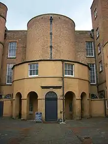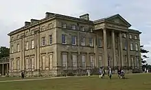 Attingham Park was designed by George Steuart, a follower of James Wyatt, whose only surviving country house this is.[7] It was built from 1772 to 1785 for Noel Hill, 1st Baron Berwick, on the site of an earlier house called Tern Hall (which had been built to his own designs by Richard Hill of Hawkstone). The proportions have been criticised: for Simon Jenkins "The facade is uncomfortably tall, almost barracks-like, the portico columns painfully thin".[8] There is a large entrance court, with an imposing gatehouse, and two single storey wings stretch out to either side of the main block.