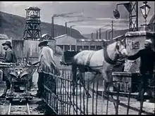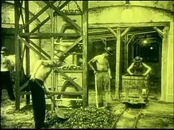 5. In the tunnels. Set representing a coal elevator at the crossing of several mining tunnels. Workers load a wagon with coal before it goes up. The camera pans 90° left to show the tunnel where men are extracting the coal. A horse draws a wagon full of coal. The men take a break for lunch.