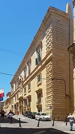 The Auberge d'Italie (Maltese: Berġa tal-Italja, Italian: Albergo d'Italia) is an auberge in Valletta, Malta.[1] It was built at various stages in the late 16th century to house knights of the Order of Saint John from the langue of Italy, and it originally had a Mannerist design by Girolamo Cassar and several other architects. The building continued to be modified throughout the course of the 17th century, with the last major renovation being carried out in the 1680s during the magistracy of Gregorio Carafa, giving the building a Baroque character.[2]