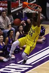 On March 3 against Northwestern, Dawkins posted a career-high 21 points in a 49-minute double overtime appearance.[23][24] On March 7, Michigan won its Big Ten Conference finale against Rutgers with a career-high scoring effort by Dawkins (31). The 31 points was the most by a Michigan freshman since Trey Burke posted 32 against Minnesota on March 9, 2012 in the 2012 Big Ten Conference Men's Basketball Tournament. The 31-point effort included eight three-point field goals (on 11 attempts), the second most ever by a Wolverine, the most by a Wolverine since Glen Rice posted 8 on March 23, 1989, vs. North Carolina in the 1989 NCAA Men's Division I Basketball Tournament and the most by a Big Ten player during the 2014–15 NCAA Division I men's basketball season, earning Dawkins the final Big Ten Freshman of the Week honor for the 2014–15 Big Ten Conference men's basketball season.[25][26][27][28] At the time of the honor, Michigan head coach John Beilein noted that over the course of the season, he and his staff had worked with Dawkins to reconstruct the delivery of his jump shot: "He came in with an extremely high arch and a slow release...He's really done a great job of speeding up his delivery, lowering his arch..."[29] On March 12, Dawkins continued his hot streak with a team-high 18 points against Illinois in the second round of the 2015 Big Ten Conference Men's Basketball Tournament to help Michigan extend its streak of opening round wins in the tournament to 9.[30][31][32] His performance included 8 consecutive points during Michigan's 23–4 run to end the first half and two memorable dunks.[33] For conference play of the 2014–15 Big Ten Conference men's basketball season, Dawkins led the league in both Effective field goal percentage and True shooting percentage,[34] but that season did not show strengths in other aspects of the game such as assists, rebounding, defense and drawing fouls.[35] By the following July, Dawkins put on 15 pounds (6.80 kg) pounds.[36]