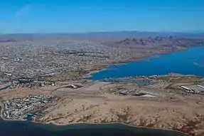 ![]() View southeast. The dark Aubrey Hills are adjacent the east side of Lake Havasu, southeast of Lake Havasu City. (expandable photo) | |