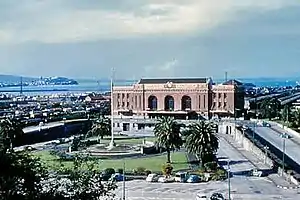 The symmetrical facade of the three storey-high building was constructed of reinforced concrete, faced with brick[1] and Coromandel granite.[4] It is approached by a sweeping ramp on either side of the building, enclosing a landscaped garden immediately to the front. The building's design echoed American models, such as Union Station in Washington, D.C. and Pennsylvania Station in New York City, considered the most striking and luxurious examples of the time.[1] It has also been favourably compared with Grand Central Terminal, in New York City as well, and the National Theatre in Melbourne.[2]