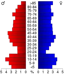 In the county, the population was spread out, with 25.90% under the age of 18, 5.00% from 18 to 24, 22.70% from 25 to 44, 22.90% from 45 to 64, and 23.50% who were 65 years of age or older. The median age was 42 years. For every 100 females there were 92.00 males. For every 100 females age 18 and over, there were 89.10 males.