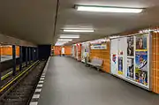 The station has 2 side platforms with exits at each end and a passenger tunnel under the tracks. The walls are tiled in dark orange or "red-brown".[2] As at Spichernstraße, there is a drop ceiling which causes a powerful draught.[1] There are only stairs at the exits, thus this station is inaccessible to the handicapped.