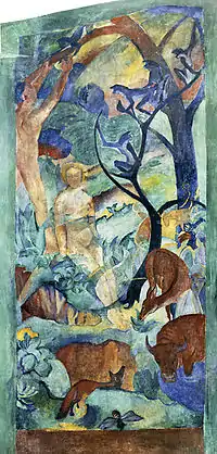 On October 5, 1909, August Macke married his long-time girlfriend, Elisabeth Gerhardt. The couple first lived on Tegernsee, then moved to Bonn. Macke painted continuously, was increasingly finding his direction and urgently needed a studio. This was set up in the attic of the house of his mother-in-law, Sophie Gerhardt, built in 1877-1878, at Bornheimer Strasse 88 (now 96); the renovation was carried out according to plans by the Bonn architect Hermann Schmitt. The father-in-law, the entrepreneur Carl Heinrich Gerhardt, had bought the house in 1884 as his company's archive and furnished it for the purpose. He died in 1907. In February 1911 Macke moved into this house with his wife and son Walter. The studio was Macke's first and only. The few years when was able to work there turned out to be his most productive. The artist completed more than 400 paintings while living in the house. He also often painted his surroundings, the view from the house, the streets and the garden. At the time, Macke had made relatively long journeys to know better modern painting, innovative artists and new surroundings. In the place where he now lived, he welcomed people like Franz Marc, Max Ernst, Guillaume Apollinaire, Robert Delaunay, Gabriele Münter and Paul Klee. With Franz Marc, Macke painted the large mural Paradise on the studio wall in 1912. It was dismantled in 1980 and is now in the Westphalian State Museum of Art and Cultural History in Münster. It was replaced by a copy in the original size, now on display in the Macke Museum.