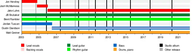 August Burns Red is an American metalcore band from Lancaster, Pennsylvania, formed in 2003. The band's current lineup consists of lead guitarist John Benjamin "JB" Brubaker, rhythm guitarist Brent Rambler, drummer Matt Greiner, lead vocalist Jake Luhrs and bassist Dustin Davidson. The band was nominated for a Grammy Award in 2016 for Best Metal Performance for the song "Identity" from its 2015 release Found in Far Away Places, and again in 2018 for "Invisible Enemy" from Phantom Anthem (2017). The band has released nine studio albums to date; their latest, Guardians, was released on April 3, 2020.