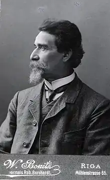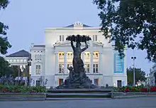 Volz' firm was also took active part in supplying decorations for both the present-day Latvian National Opera and the Latvian National Theatre. The entirety of the interior decoration for the opera was entrusted to Volz,[18] while for the theatre the firm of Volz supplied the Atlas figures flanking the entrance while the interior decoration was entrusted to the firm Otto & Wassil.[19]