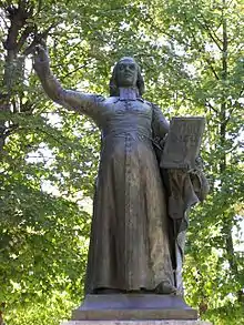 He called himself "Michaut des monnaies " (Michaut of the Mint )[20] for he did not wish to be mistaken for a general called Michaux who fought the Napoleonic Wars and lived rue de Vergennes too. He made a living out of annuities, rents from the various apartments he owned in Versailles and Paris and a 300 francs yearly housing pension he had been benefiting since 1832 emanating from the Fine Art and Science Office attached to the Ministry of Trade and Public Works. His friendship[21] with the Director of the Institute for the Deaf and Dumb, Desiré Ordinaire – who was an admirer of the Abbé Charles-Michel de l'Épée the founding father of free education for deaf and dumb children; he was also the inventor 1770, of the first language created based on a system of signs, – led him to produce his very last work . At first it consisted of a bust,[22] however Michaut's father long illness took him away him from this project for a while. But in 1839, he started circulating an effigy[23] of the Abbé he had executed . A commission was eventually constituted in Versailles, whose function was to supervise the making of " a monument à l'Abbé de l'Épée". Charles Michel de l' Épée was originally from Versailles and the monument was built to help raising funds for the Institute. He sculpted the statue and cast it into bronze at his own expense in 1843.[24] The Abbé is represented standing while holding in his left hand a tablet on which is carved the word DIEU (GOD). His right hand is raised up as his fingers are shaping what stands for a D in sign language .