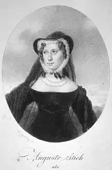 Whether there was actually a sexual relationship between the officer Blücher and Auguste Stich is unclear.[3] When Stich returned to the stage as "Thecla" on 8 May of the same year, she was already pre-judged by the audience and booed as an adulteress. To escape this, she travelled to Paris with her husband in early 1824, where she met, among others François-Joseph Talma. According to statements by Ludwig Rellstab (Nothgedrungene Berichtigung), the actor Wilhelm Heinrich Stich died of an infected spleen.