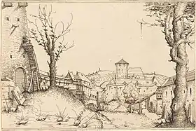 His pen-and-ink landscapes have been described as "strong but light, sure but delicate".[5] The lack of shadow in his landscapes contributes to a tranquil, idyllic mood. Almost 100 drawings are attributed to him; some are likely not his own, but are similar in style to his or Wolf Huber's work. His art shows the influence of Albrecht Dürer, Albrecht Altdorfer, Sebald Beham, Hans Burgkmair, and Agostino del Musi—some of whom had provided his father's workshop with designs.