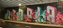 These frescoes were in the open air when they were created in 2015 but are today confined in the tunnel of Louvain-la-Neuve's Central Ring (Boulevard André Oleffe) following the construction of the Resort Urbain Agora hotel and residential complex.[12]