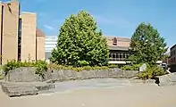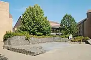 East of the Aula Magna, Place Montesquieu houses a vast blue stone sculpture, created by sculptor Pierre Culot in 1980 and entitled Ronde des menhirs, made of stone blocks 40 to 300 cm high forming a 26-metre amphitheatre.[15]