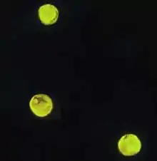 Oocysts of Cryptosporidium parvum stained with the fluorescent auramine–rhodamine stain.