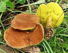 Aureoboletus innixus is a species of bolete fungus in the family Boletaceae. Found in eastern North America, it was first described scientifically by Charles Christopher Frost in 1874, from collections made in New England.[3] An edible mushroom, the convex cap grows to 3–8 cm (1.2–3.1 in) wide and is dull reddish brown to yellow brown. The stem is 3–6 cm (1.2–2.4 in) long by 1–1.6 cm (0.4–0.6 in) thick, but often swollen at the apex with a tapered base. It has a bright yellow pore surface when young that dulls in color when mature. There are about 1 to 3 pores per mm when young, but they expand as they mature to about 2 mm wide. The spore print is olive-brown, and the spores are ellipsoid, smooth, and measure 8–11 by 3–5 um.[4]