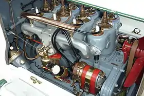 The high-speed type "T"-head vertical straight four-cylinder engine has a bore and stroke of 76 mm × 88.9 mm (3 in × 3+1⁄2 in) giving a capacity of 1615 cc and an RAC and fiscal rating of 14.32 horsepower. The cylinders are cast separately in spite of the general trend to monobloc engines. As before the engine is arranged to have interchangeable exhaust and inlet valves on opposing sides of the engine.[7] Engine output was quoted as 12.5 brake horsepower at 1,000 r.p.m. and fully 16 brake horsepower on acceleration to 1,500 r.p.m.[5]