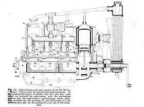 On the right hand side of the engine there is dual ignition at each cylinder first from the magneto supplying low-tension power to complex ignitors inside the inlet valve caps and again from conventional high-tension sparking plugs through a distributor from the accumulator (battery) dynamo and coil. The low tension igniter and the high tension sparking plug are mounted on the inspection cover above the inlet valves.[1]