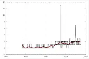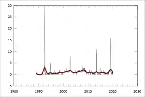 Uruguayan Australians are an ethnic minority in Australia with populations in larger Australian cities, primarily Sydney (especially Fairfield) and Melbourne.[24] The first migrants from Uruguay came to Australia during the 1960s during a time of political and economical hardship, with growing numbers in the 70s due to military dictatorship with the migration peak in 1974.[25][26] By 1981 the Uruguayan population in Australia reached almost 9300, then after the restoration of democracy in Uruguay it rose slowly to 9715 in 1996.[27] In 1981 80% lived in New South Wales, and 17% in Victoria.[27]