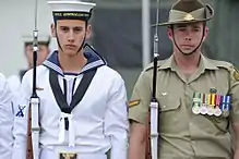The posting strength of AFG varies, although the unit's authorised strength is around 170 personnel of all ranks.[1] A Royal Guard consists of 32 members from each service, one left marker, one right marker, two flag bearers and one parade officer. The Navy contingent of the Guard always appears on the left hand side of a parade, with Army in the centre and RAAF on the right. This reflects the seniority of the services.