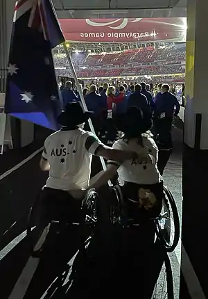 In November 2019, wheelchair rugby player Ryley Batt and table tennis player Daniela di Toro, were named as co-captains.[3] They were also named as joint flag bearers at the Opening Ceremony.[4] Ellie Cole was the flag bearer at the Closing Ceremony. Cole became Australia's most decorated female Paralympian during the Games with her silver and bronze medals in swimming taking her to 17 Paralympic medals.[5]