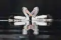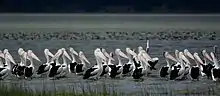 Australian pelicans feed by plunge-diving while swimming on the surface of the water. They work in groups to drive fish to shallower water, where they stick their sensitive bills in to snatch their prey. Some feeding grounds in large bodies of water have included up to 1,900 individual birds. They will sometimes also forage solitarily. Their predominant prey is fish and they commonly feed on introduced species such as goldfish, European carp and European perch. When possible, they also eat native fish, with a seeming preference for the perch Leiopotherapon unicolor. However, the Australian pelican seems to be less of a piscivore and more catholic in taste than other pelicans. It regularly feeds on insects and many aquatic crustaceans, especially the common yabby and the shrimps in the genus Macrobrachium. This pelican also takes other birds with some frequency, such as silver gulls, Australian white ibis and grey teal, including eggs, nestlings, fledglings and adults, which they may kill by pinning them underwater and drowning them.[9][10] Reptiles and amphibians are also taken when available. Reportedly even small dogs have been swallowed. The Australian pelican is an occasional kleptoparasite of other water birds, such as cormorants.[9] Cannibalism of young pelicans has also been reported.[10]