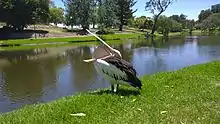 The Australian pelican is medium-sized by pelican standards, with a wingspan of 2.3 to 2.6 m (7.5 to 8.5 ft). Weight can range from 4 to 13 kg (8.8 to 28.7 lb), although most of these pelicans weigh between 4.54 and 7.7 kg (10.0 and 17.0 lb).[3][4][5] The average weight of four unsexed Australian pelicans was 5.5 kg (12 lb), making this the second heaviest Australian flying bird species on average, after the brolga, although the male of the more sexually dimorphic Australian bustard weighs a bit more at average and maximum weights (both birds are, of course, much smaller than the cassowary and emu).[6][7] The pale, pinkish bill is enormous, even by pelican standards, and is the largest bill in the avian world. The record-sized bill was 50 cm (20 in) long.[8] Females are slightly smaller with a notably smaller bill, which can measure as small as 34.6 cm (13.6 in) at maturity. The total length is boosted by the bill to 152–188 cm (60–74 in), which makes it rank alongside the Dalmatian pelican as the longest of pelicans.[9]