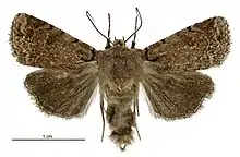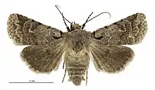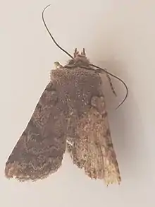 Austramathes fortis is a species of moth in the family Noctuidae.[2] It is endemic to New Zealand and is found in both the North and the South Islands but has yet to be recorded at Stewart Island. It can be found in shrubland containing its host species at a range of altitudes from sea-level up to 1840 m. The larvae of this moth feed on several Melicytus species including M. crassifolius, M. alpinus, M. macrophyllus and M. novae-zelandiae. The larvae pupate in a cocoon of silk at the base of its host plant. It can take between 25 and 45 days before the adult moth emerges. Adults can be found on the wing during the months of July to March. The adults tend to be on the wing in twilight hours but have also been known to be active during the late afternoon. They are attracted to light but this behaviour may limit the number seen at light traps. The distinguishing feature of this moth is the curved black line at the base of its forewing. This species is unlikely to be confused with any other species in its range but it is very similar in appearance to A. squaliolus. However this latter species is only found on the Chatham Islands.