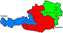 The Austrian Regionalliga (German: Regionalliga or plural Regionalligen, means Regional League) is the third-highest division in Austrian football, after the Austrian Bundesliga and the Second League. It is divided into 5 groups: East (Ost), covering the states of Vienna, Lower Austria and Burgenland; Central (Mitte), covering the states of Styria, Carinthia, Upper Austria and the exclave of East Tyrol; Regionalliga Salzburg, covering the state of Salzburg; Regionalliga Tirol, covering the state of Tyrol (with the exception of East Tyrol) and the Eliteliga Vorarlberg, covering the state of Vorarlberg.