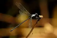 Austroargiolestes elke is a medium-sized to large, black and blue damselfly, with strong pruinescence on adult bodies.[4] Like other members of the family Megapodagrionidae, it rests with its wings outspread.[6]