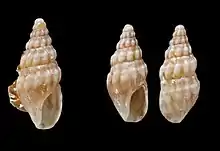 This small, brownish shell has a fusiform-ovate shape. It contains 6 whorls, including two convex whorls in the protoconch. It shows 10-12 ribs, Their superior part is almost obsolete and they are almost indistinctly subnodose at the sutures. The oval aperture is small. The outer lip is sharp, slightly ascending at the suture. There is a white band on the body whorl. It is subdivided by a fine line of the same colour as the rest of the shell. A few wavy darker brown lines flow down the lower portion of the body whorl.[2]