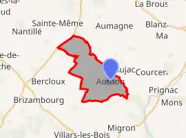 Authon-Ébéon is located in the north-east of the department of Charente-Maritime some 25 km north-east of Saintes and 20 km south-east of Saint-Jean-d'Angély and is in the former province of Saintonge. The village is at the crossroads of the D120 from Sainte-Même in the north to Migron in the south and the D134 from Brizambourg in the west to Courcerac in the east. The D129 also forms the north-western border of the commune. Apart from the village there are the hamlets of Bargagne in the south and Ebeon in the north. The commune is mostly farmland with some small scattered forests.[4]