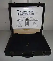 A disposable piece of paper, shaped like the toilet seat itself and known as a disposable toilet seat cover or toilet sheet, can be placed on the seat. Its purpose is to make the toilet user feel more reassured that they are protected from germs.[7] The first known patented model of the toilet seat cover dispenser dates back to 1942 and was invented by J.C. Thomasa.